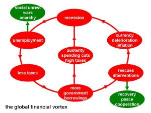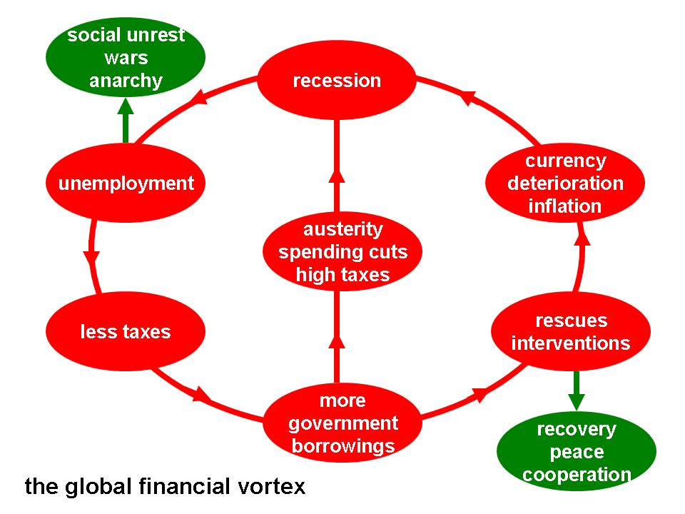The global financial vortex flowchart shown below reflects the growing momentum towards a global crisis, and the dilemma of new solutions creating new bigger problems. We need a lot of soul-searching, radical structural changes, and a return to basics. Most of all, we have to stop fighting. Harmony is the key. We need to work together to contain the financial hurricane brewing, a unified action to make radical incisions to contain the growing cancer. We need also to pray for peace and recovery.