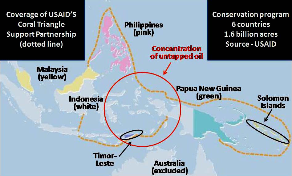Is the conservation program of the oil-multinational-funded World Wildlife Fund (WWF) in the Coral Triangle an ‘advance party’ for oil exploration? The 1.6-billion-acre Coral Triangle, reputed to be the richest marine biodiversity area in the planet, covering six countries, is regarded by oil multinationals to also be the richest in vast oil reserves. WWF, Conservation International, and Nature Conservancy have forged a conservation cooperation with these six Asian countries through the USAID-funded Coral Triangle Support Partnership (CTSP). Are we discerning oil wolves disguised as green sheep? Let us look at some facts.