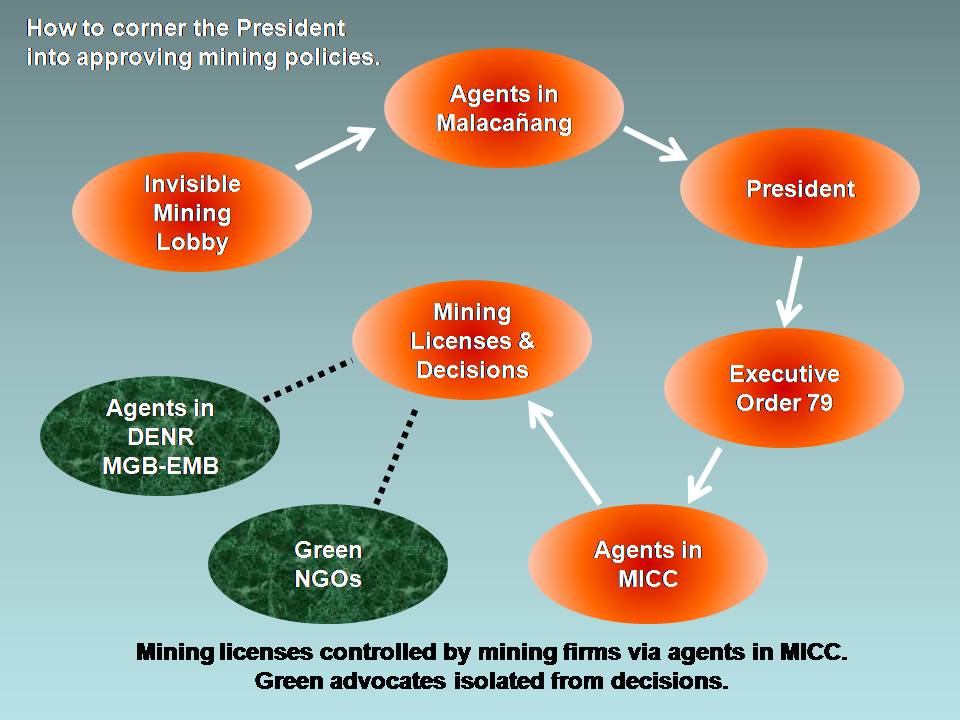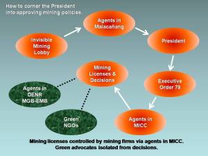 How powerful is the MICC in influencing mining decisions in favor of miners and against environmentalists. President Aquino’s EO 79 has centralized certain mining decisions to the MICC, under the Office of the President. The powerful and invisible mining lobby’s goal is total control of all mining decisions via the MICC. The graph below tells it all. Click or CTL+click to view blow up or zoom in