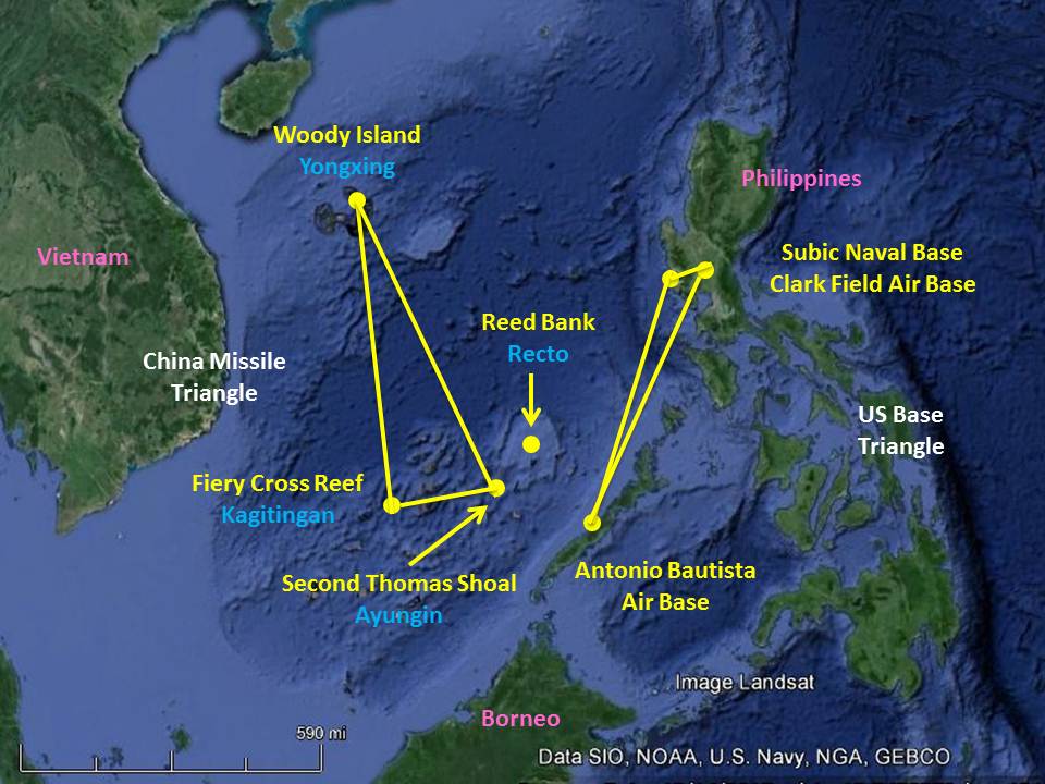 The US ‘Base Triangle’ consists of Subic Naval Base and Clark Field Airbase in Luzon, and Antonio Bautista Air Base in Palawan, which are part of the 5-identified bases in the recent Supreme-Court-endorsed Enhanced Defense Cooperation Agreement (EDCA), which in turn is complimentary to the Philippine-US mutual defense agreement Visiting Forces Agreement (VFA).