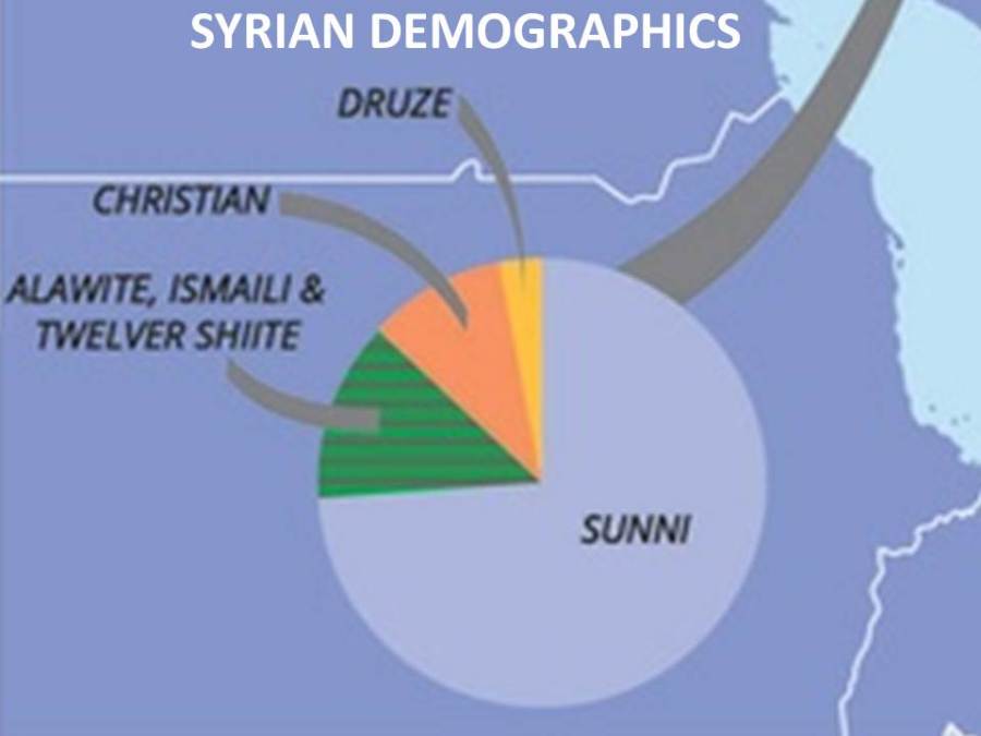 The pie graph zooms in to the Syrian demographics, where the majority Sunnis are fighting the minority Assad Shiite regime, just like in Yemen, where the majority Shiite Houthis are fighting the minority Sunni regime, and where the Saudi (pro-Sunni) and Iran (pro-Shiite) are involved. This was the same in Saddam’s minority Sunni regime in Iraq versus the majority Shiite rebels before the US invasion. Ironically, the power vacuum due to the US invasion of Iraq triggered a more intensified Sunni-Shia war which rages to this day. A majority populace always rebels against an oppressive minority regime, the key ingredient to the rise of the Arab Spring.