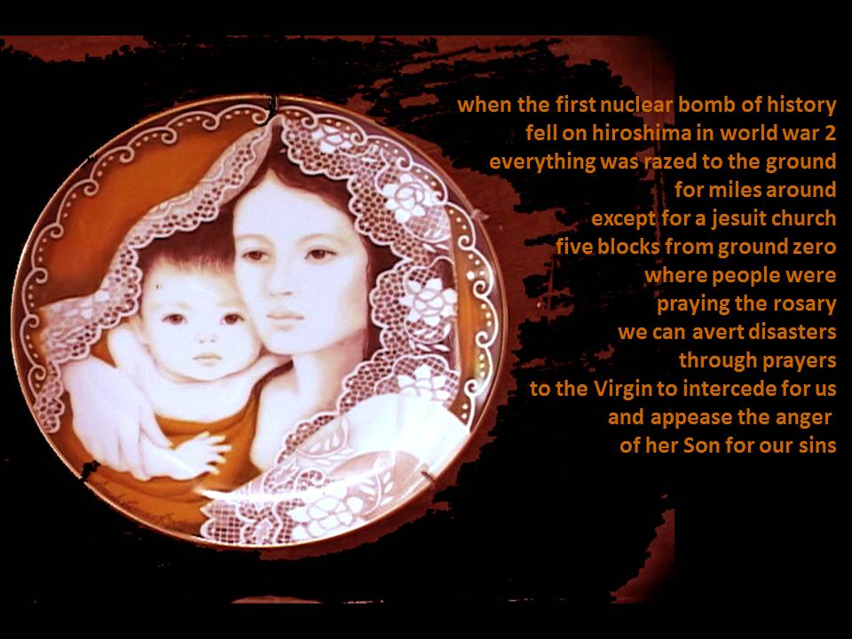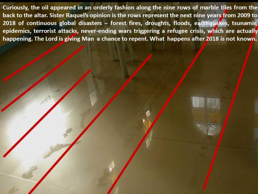 “The war in the Middle East will become serious and will spread throughout the world.” Message from Our Lady of Yvan. The controversial Third Secret, predicting massive global disasters, was revealed to visionary Sister Lucia. In fear of sowing panic, many Popes would decide not to reveal it. After 6 long decades from October 17, 1917, when Our Lady first appeared to three peasant children, and 5 decades from October 30, 1930, when the Church proclaimed Fatima’s “miracle of the dancing sun” as authentic, Pope John Paul II (1978 to 2005) finally revealed the Third Secret, which predicted his failed assassination. The bullet resides today on the crown of the original statue of Our Lady of Fatima in the Vatican. A Daughters-of-St.-Paul nun went into a sudden trance at the home of visionary Carmelo Cortez, and said, her voice changing, “I can no longer hold back the hand of my Son. Pray, pray, pray.” EVIDENCE OF HOW SATAN, THROUGH ANTI-MARIANS, HAS CONSISTENTLY TRIED TO DISTORT THE MESSAGES OF OUR LADY OF FATIMA. http://www.sisterraquel.com/2014/08/philippines-as-pilgrim-center-fatima-message-mutilated/ TSUNAMI WARNINGS AND THE FATIMA 3RD SECRET https://www.youtube.com/watch?v=GYsCwDgvr74 THE “MIRACLE OF THE HEALING OIL” IN 2009 ECHOES THE MESSAGES OF THE THIRD SECRET. The mysterious appearance of oil on the floor of the Adoration Chapel of the Mother Ignacia Healing Ministry was followed by major global disasters. It was also followed by instant healings of terminal patients. The God of Wrath is also the God of Mercy. Part 1. History. https://www.youtube.com/watch?v=owykGkNCpIg Part 2. Healing Testimonials. https://www.youtube.com/watch?v=dlREzytKuSg OFFICIAL VATICAN RECORDS ON THE THIRD SECRET OF FATIMA This lengthy Vatican archive document contains original handwritten notes of visionary Sister Lucia in Portuguese, with English translation and Vatican annotations. http://www.vatican.va/roman_curia/congregations/cfaith/documents/rc_con_cfaith_doc_20000626_message-fatima_en.html PHOTO COLLECTION ON GOD’S MERCY AND WRATH