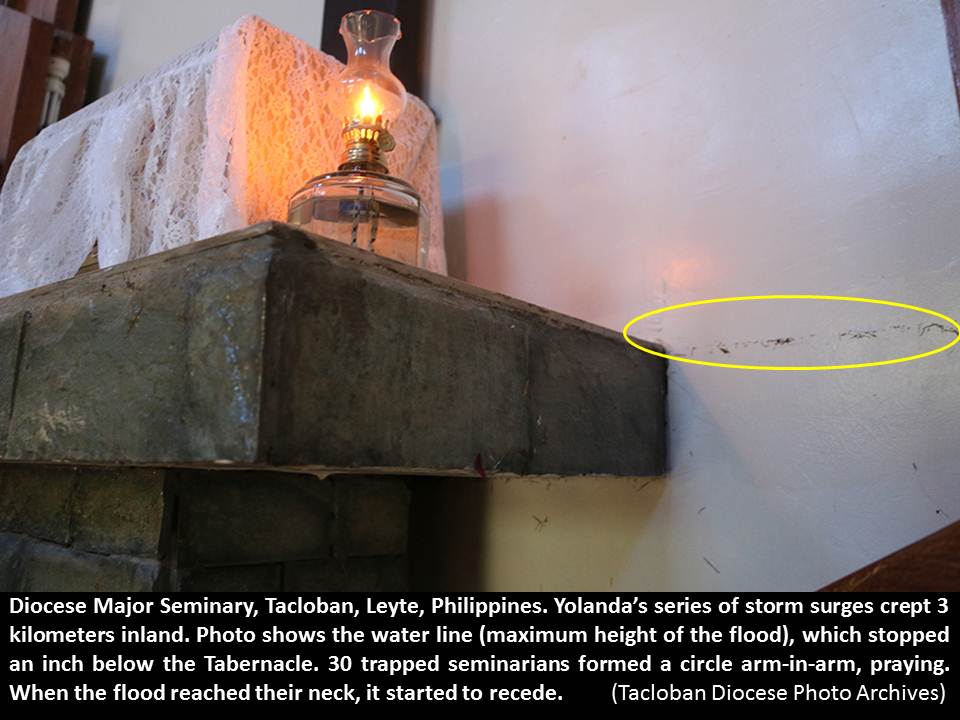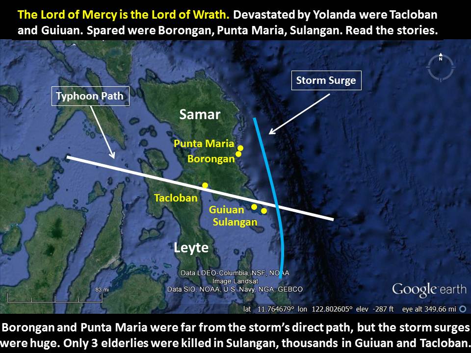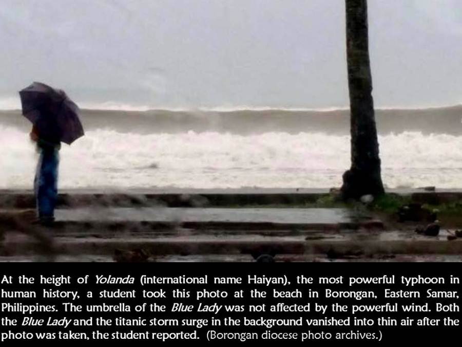 In Borongan, a student, a housewife and a teacher, who had a common story, were interviewed by the author. At the height of Yolanda, they saw a Lady near shore (just like the above photo) as a storm surge was approaching. The student even ran towards the Lady to warn her of the oncoming storm surge. As in the viral photo above, both the Lady and the storm surge vanished. There are many more undocumented stories of how the Lord spared those devout to Him and Our Lady.