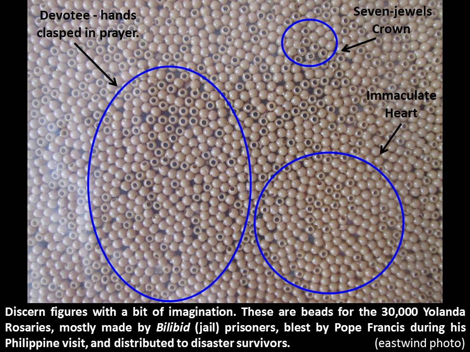 Mysteriously, some villages had little or no casualties, while neighboring ones a few kilometers away were completely devastated. In Punta Maria, in Borangan Bay, long before Yolanda came, seven elderly women prayed the rosary every day in a makeshift chapel. It was in the direct path of Yolanda, yet there were no casualties and storm surge, although a few houses near shore were destroyed by the wind. The same case happened in Ando Island in Borongan Bay, where women had an active rosary brigade.