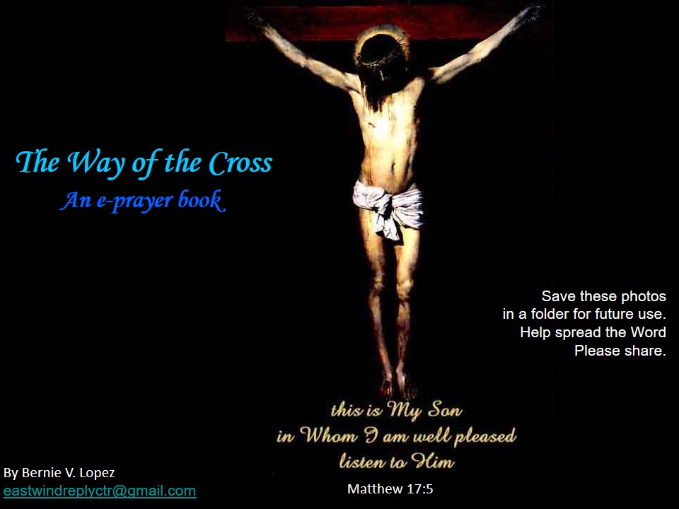 WAY OF THE CROSS * an e-prayer book * eastwind Posted byeastwind77March 25, 2018February 21, 2021Posted ineastwind journals THE WAY OF THE CROSS An e-prayer book http://www.sisterraquel.com/2018/03/way-of-the-cro eastwind journals by Bernie V. Lopez eastwindreplyctrr@gmail.com DOWNLOAD THE POWERPOINT SHOW (PPS) – 0 power point MUSIC aranjuez no 8 PPS OR SIMPLY VIEW/SAVE PHOTOS (JPEGs) – 0 1 2 3 4 5 6 7 8 9 10 11 12 13 14 amdg Share this: Share on X (Opens in new window) X Share on Facebook (Opens in new window) Facebook Like Loading...