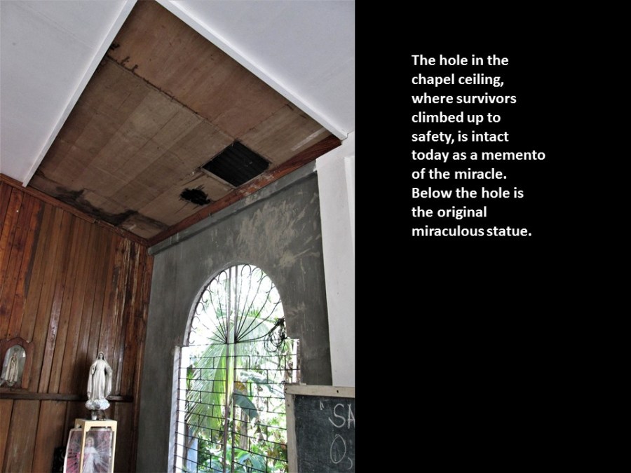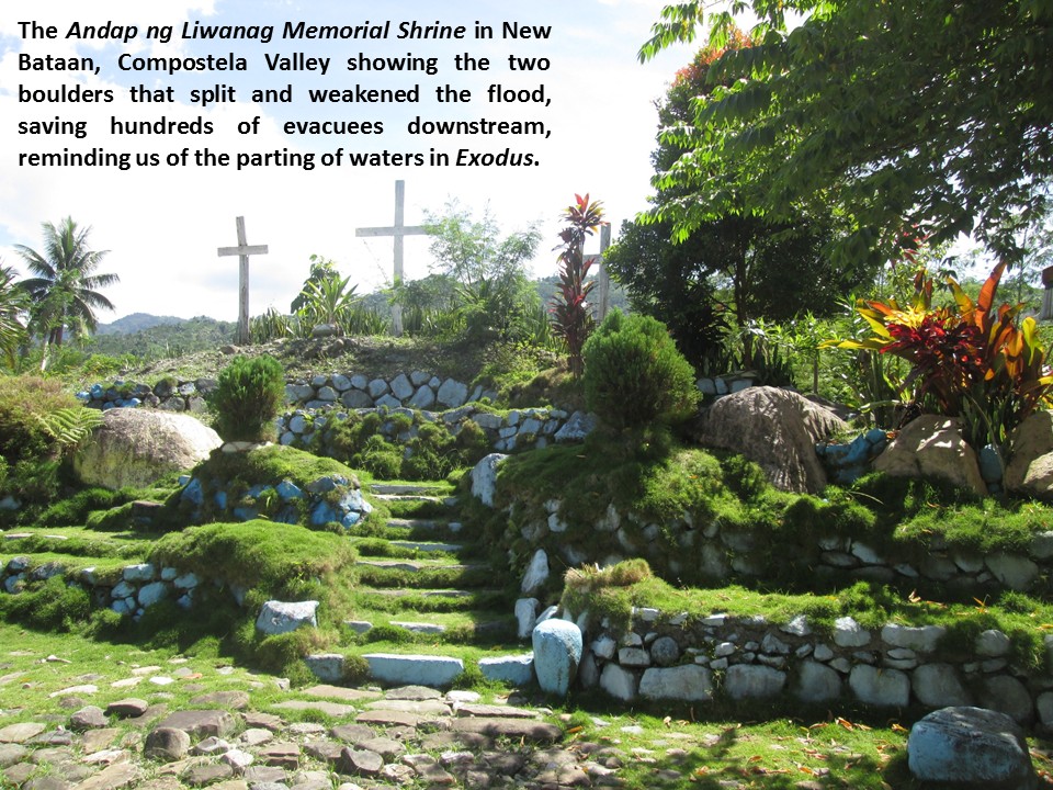A second miracle occurred at Barangay Andap, a few kilometers upstream of Kibinuangan. Two giant boulders split and weakened the flood, protecting hundreds of evacuees at the San Roque Chapel and at the marketplace downstream. The evacuees punched a hole in the ceiling of the chapel to reach the safety of the roof. A memorial shrine called Andap ng Liwanag (Andap of Light) was built in between the two boulders which parted the raging waters. A ‘tower of hope’ was built to mark the highest level of the flood.