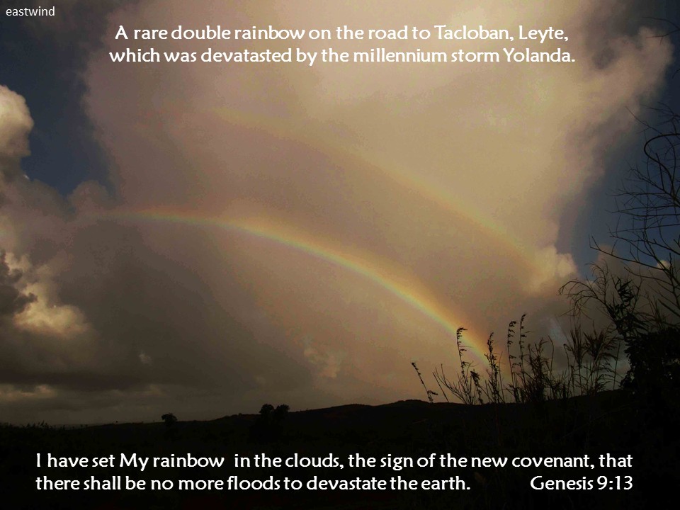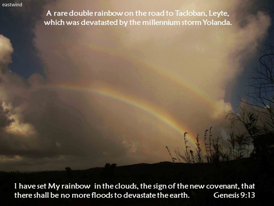 This article was written on the anniversary of Our Lady of Fatima, September 20, 2015. News went viral in the Internet that, a day before, the eyes of the statue of Our Lady of Lourdes blinked several times. True or not to doubters and believers, we may now be in the midst of ‘tribulations’ prophesied in the Book of Revelation and the Third Secret of Fatima – an era of cataclysms, due to global warming as much as perhaps our sins. Yet the rainbow of hope will always be there to uplift us in the darkness and despair of our lives, as long as we return to the Lord and atone for our sins.