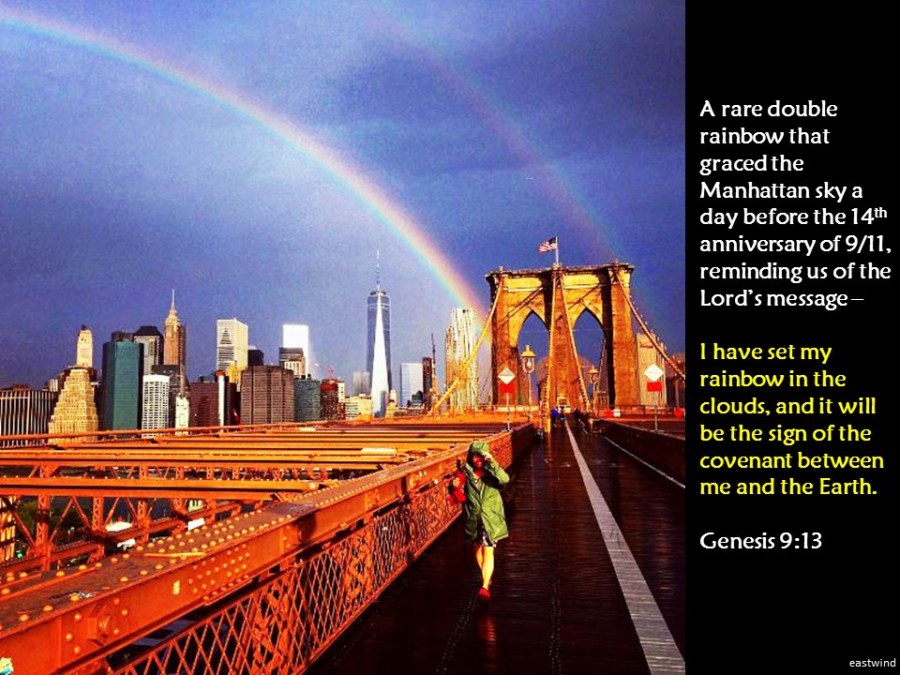 A day before the 14th anniversary of 9/11, another rare double rainbow shone brilliantly across Manhattan. It is the same reminder from the Lord of His message to Noah, for us to stay with Him during trying times. (Photo by Ben Sturner – 9/11-rainbow-of-hope).