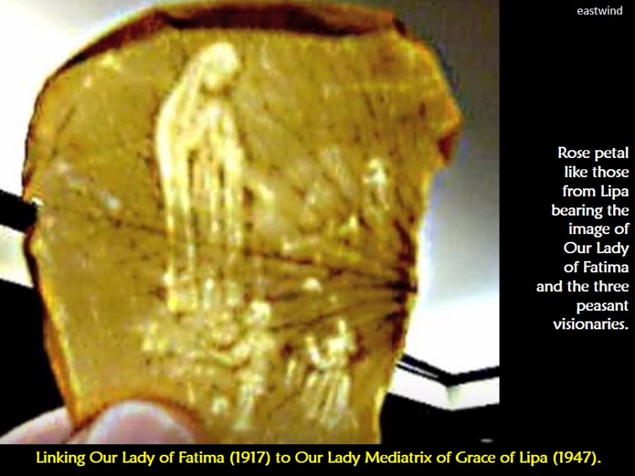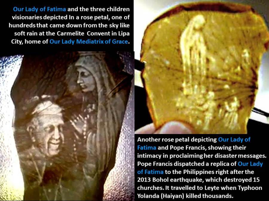 Second Sign. Fatima Replicated in Lipa. The Mediatrix, the key to China’s conversion, is the NEW FATIMA. The Fatima miracle of the sun in 1917 was duplicated in Matalam, North Cotabato, Philippines exact on the hour and day of the Fatima centennial anniversary in the shrine for Our Lady Mediatrix of All Grace. The first Mediatrix miracle was in the Carmelite Convent in Lipa City in 1947, where hundreds of rose petals bearing religious images fell from the sky.