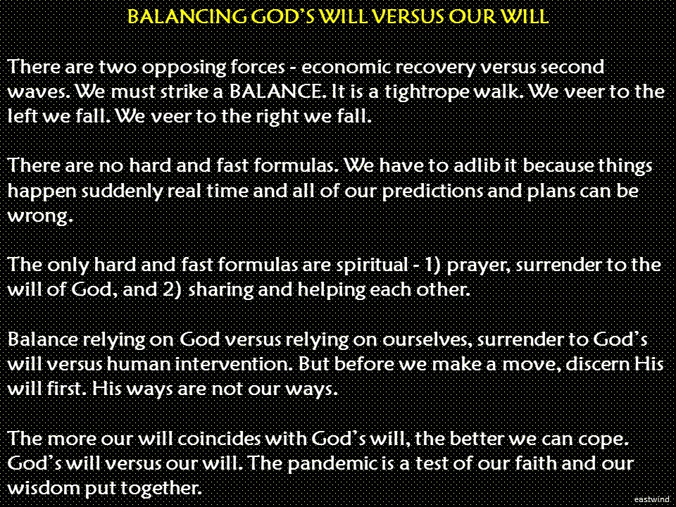 During this pandemic, for God’s will to act in our favor, our will has to align with his, which requires strong faith and surrender to his will. Those who rely more on themselves sometimes fail but those who rely more on the Lord never fail. Throughout the Old Testament days, in the battlefield, the Israelites would lose when they displeased the Lord, and would win against overwhelming odds if they were loyal to him. The same with us during this pandemic.