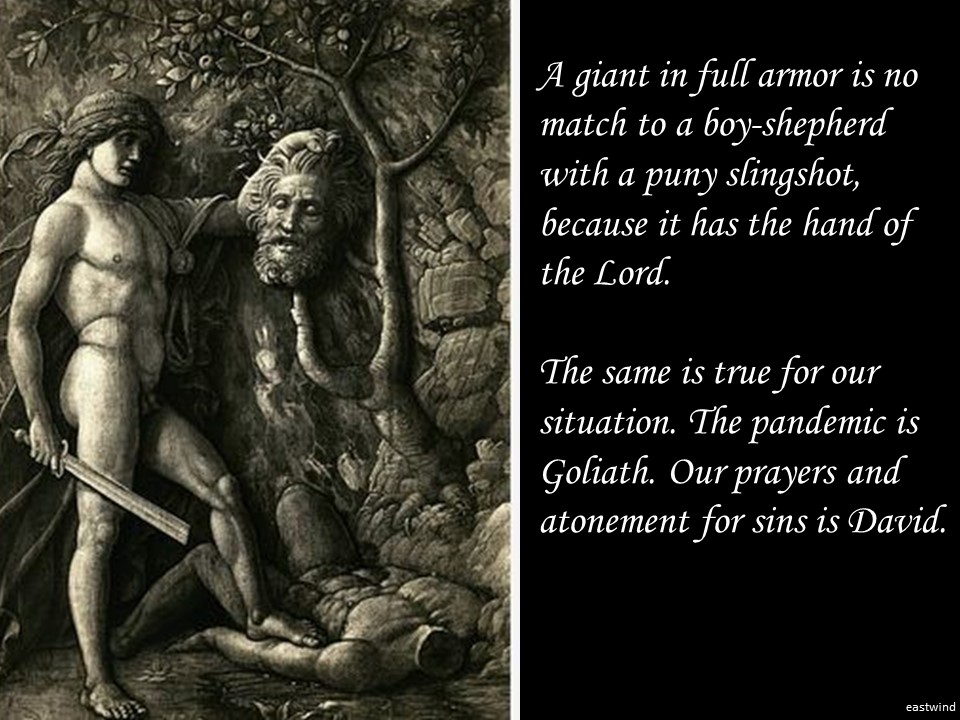 Learn to balance reliance on God versus reliance on our will, surrender to God’s ways versus dependence on our own skills. The more our will coincides with God’s will, the better we can cope. This is the way to surmount the Goliath pandemic.