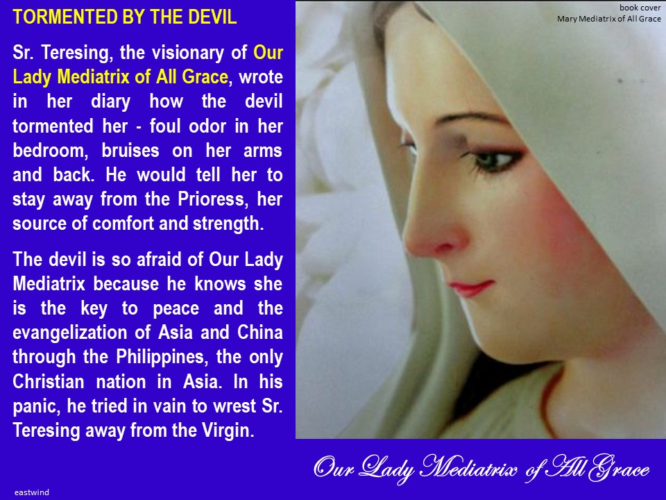 Author’s Note. The devil tormented Sr. Teresing because he knew how important Our Lady Mediatrix was in the Church’s evangelization efforts. In his article Ecclessia in Asia (November 1999), St. John Paul II wrote that the first millennium was devoted to the evangelization of the Old World (31 AD or the death of Christ to 1000 AD), the second millennium (1001 to 2000) to the evangelization of the New World, and the third millennium (2001 to 3000) to the evangelization of Asia. In the devil’s panic, he instilled fear on Sr. Teresing to prevent her from receiving the messages of Our Lady. But the Virgin prevailed.