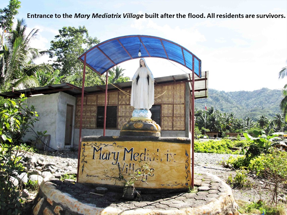 Sixteen years old Joseph Babag was the lone survivor of his family of six. When the flood came without warning, Joseph’s family together with about 50 evacuees at a health center were all swept away a few kilometers downstream towards the St. Anthony Parish. The water was so powerful, it lifted the very foundation of the health center and smashed it into pieces, Joseph recalled. Joseph clung to the trunk of a coconut tree to survive. Parish priest Fr. Tuling adopted Joseph and was studying to be a teacher as of March 2018, He was thinking of joining the priesthood. Perhaps he was saved to serve the Lord. Fr. Tuling said, “We are now the hands of the handless Virgin. Let us use them to reach out to the needy”.