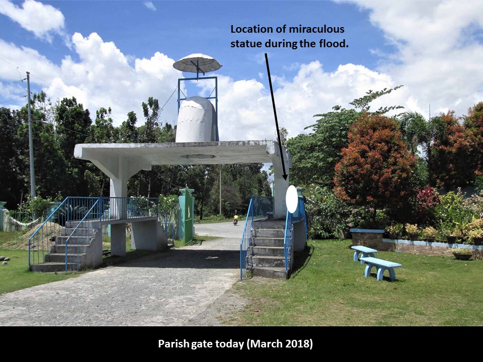 A second miracle occurred at Barangay Andap, a few kilometers upstream of Kibinuangan. Two giant boulders split and weakened the flood, protecting hundreds of evacuees at the San Roque Chapel and at the marketplace downstream. The evacuees punched a hole in the ceiling of the chapel to reach the safety of the roof. A memorial shrine called Andap ng Liwanag (Andap of Light) was built in between the two boulders which parted the raging waters. A ‘tower of hope’ was built to mark the highest level of the flood.