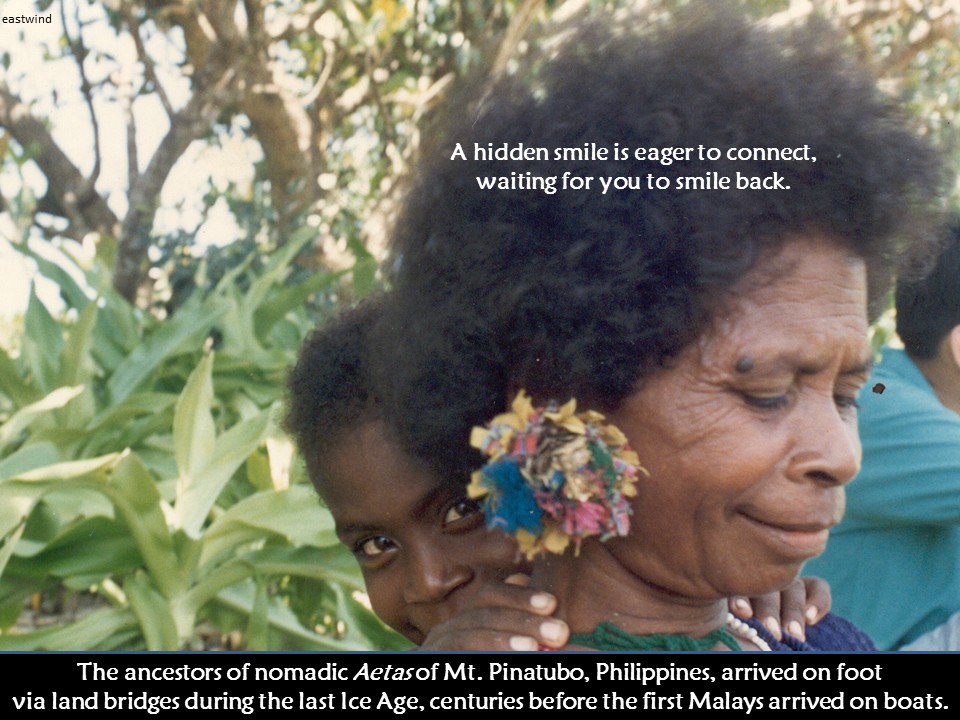 Because it was dangerous to hike alone in a remote place with no villages around, Sister Gilda asked an Aeta to be her guide. Aetas are aborigines, small dark-skinned nomads with kinky hair, whose ancestors were the first migrants to arrive in the Philippines on foot centuries before the first Malays arrived by boat. During the last Ice Age about 10,000 years ago, the sea level fell several meters as polar ice caps grew, creating ‘land bridges’ connecting the islands to the China mainland.