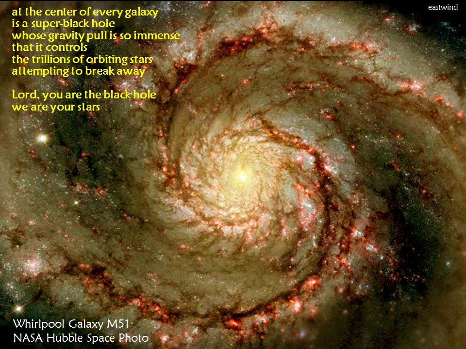 At the center of every galaxy is a super-blackhole whose gravity is so immense that it controls trillions of orbiting stars. Lord, you are the blackhole, we are your stars.