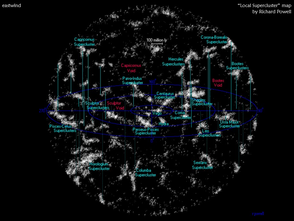 “A supercluster is a large group of smaller galaxy clusters or galaxy groups;[1] they are among the largest known structures in the universe. The Milky Way is part of the Local Group galaxy group (which contains more than 54 galaxies), which in turn is part of the Virgo Supercluster, which is part of the Laniakea Supercluster.[2] The large size and low density of superclusters means that they, unlike clusters, expand with the Hubble expansion. The number of superclusters in the observable universe is estimated to be 10 million.[3] ” (Wikipedia.)
