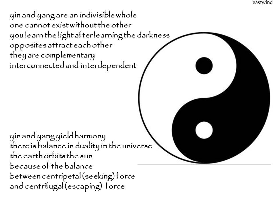Harmony is achieved by balancing your yin and yang, which are an indivisible whole. One cannot exist without the other. You learn about the light after learning about the darkness. Opposites attract and complement each other. Yin and yang are irreversibly inter-connected and inter-dependent.