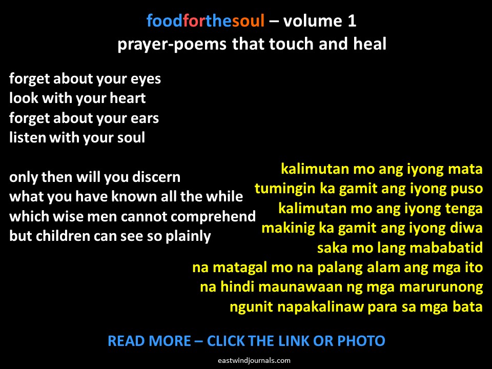 foodforthesoul – prayer-poems that inspire and heal – volume 1 Posted byeastwind77January 24, 2023April 3, 2023Posted inUncategorized Go to new version by clicking this link = https://eastwindjournals.com/2023/04/02/foodforthesoul-volume-1/ COVER PRAYER POEM Share this: Click to share on X (Opens in new window) X Click to share on Facebook (Opens in new window) Facebook Like Loading...