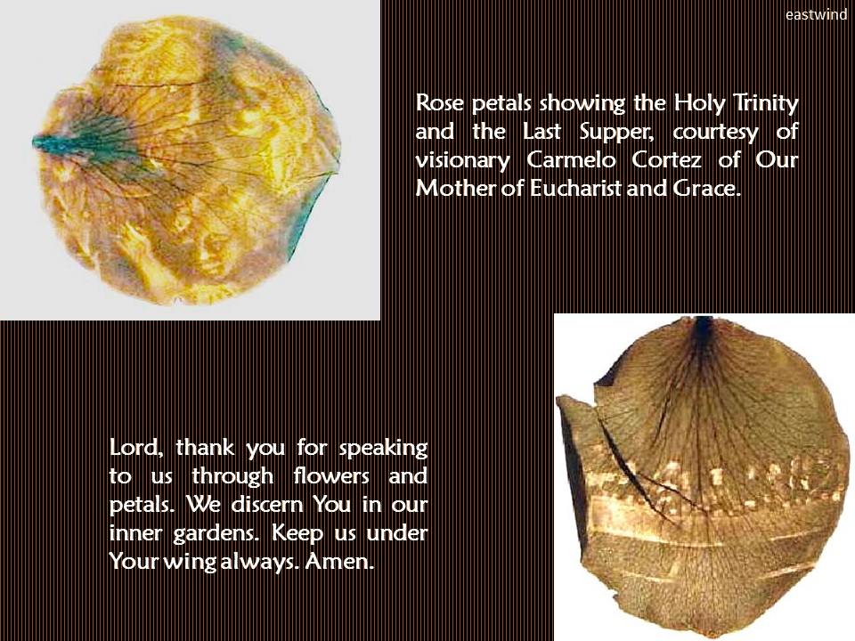 At the convent of the Carmelite Sisters in Lipa City, Philippines, center for devotion to Our Lady Mediatrix of Grace, thousands gathered as rose petals rained from the sky like manna. On the soft petals were miraculously etched, like photo slides, religious images – the Holy Trinity, the Black Madonna, Our Lady of Fatima, as shown below.