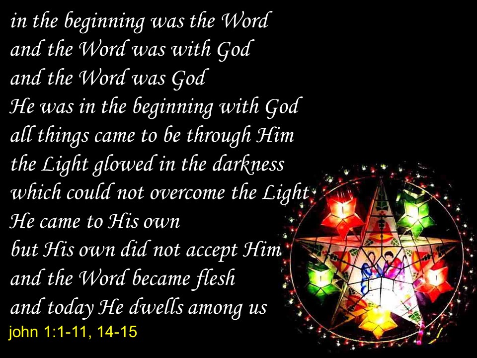 Noong umpisa ay ang Balita, at ang Balita ay nasa Panginoon, at ang Balita ay ang Panginoon. Kasama niya ang Diyos buhat noong umpisa. Lahat ng nilikha ay galing sa Kanya. Ang Ilaw ay suminag sa dilim, na hindi kayang buwagin ng dilim. Pumunta siya sa kanyang sariling angkan ngunit hindi siya tinanggap. At ang Diyos ay naging tao at ngayon siya ay kasama na natin. John 1:1-11, 14-15