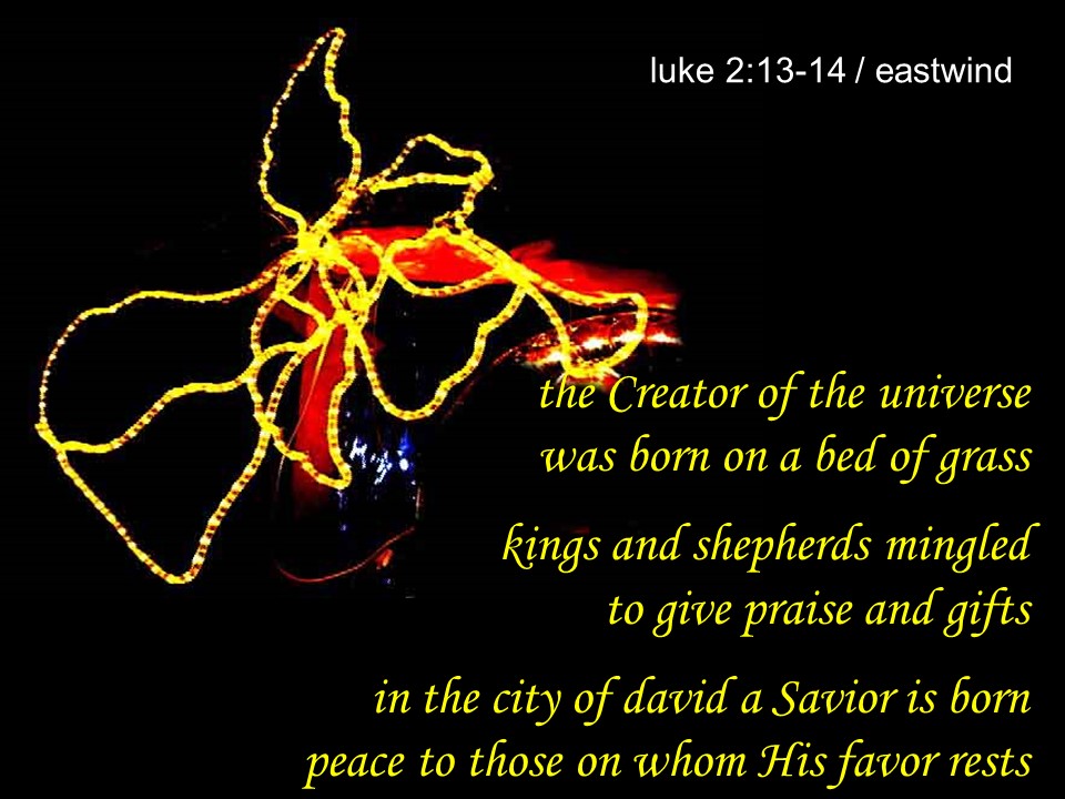 Ang naglikha ng sanlibutan ay pinanganak sa kamang may dayami. Tiklop-tuhod na nagsama ang mga hari at mga magpapastol upang sambahin ang Sanggol at upang magbigay ng regalo.