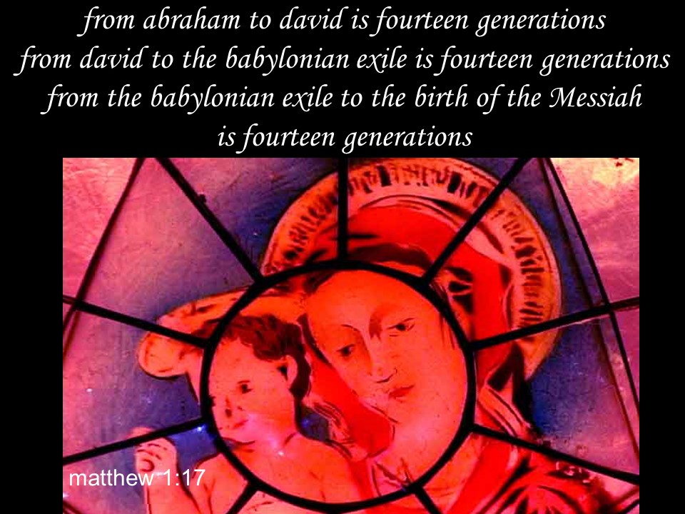 Buhat kay Abraham hanggang kay David at labing apat na henerasyon. Buhat kay David hanggang sa pagparusa sa Babylonia ay labing apat na henerasyon. Buhat sa pagparusa sa Babylonia hanggang kay Hesus, ang ating Messiah, ay labing apat na henerasyon. Matthew 1:17.