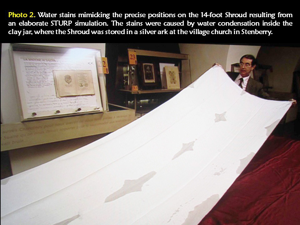STURP discovered that the Oxford carbon dating was THE hoax, not the Shroud. It reported that the Oxford team, after a long debate, chose a ‘corner’ of the Shroud for the carbon dating sample, the most handled part of the Shroud. The Shroud was strung up for display in 1578 in the public square at the Alpine town of Stenberry for many weeks. Bacteria-laden hands degraded the corners of the cloth while it was propped up for display in the blazing sun. The ‘owner’ of the Shroud, Emmanuel Filberto, allowed the display for weeks for huge crowds, exposing it to sunlight. Carbon dating is a sensitive process. The cloth, subjected to solar heat, nullifies carbon date.