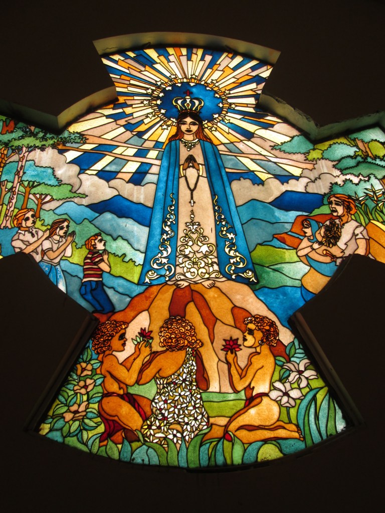 STAINED GLASS RENDITION OF INA WITH AETAS AND ZAMBALENOS IN ADORATION.
